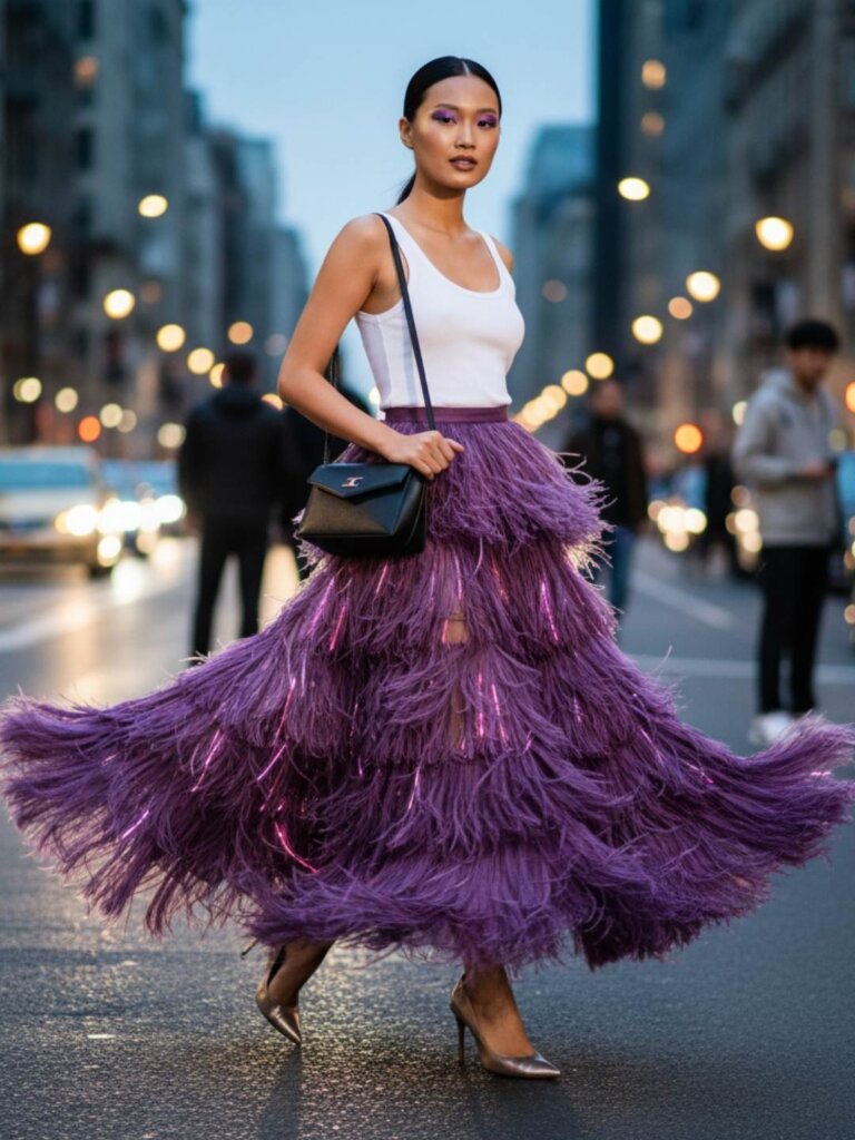 The spotlight follows your every move this month. Leo fashion trends emphasize “Fashion as Feeling” through bold self-expression. This involves a sensory experience of fringe and feathers. Vibrant violet hues dominate your visual landscape. Pair dramatic statement skirts with simple white tank tops.